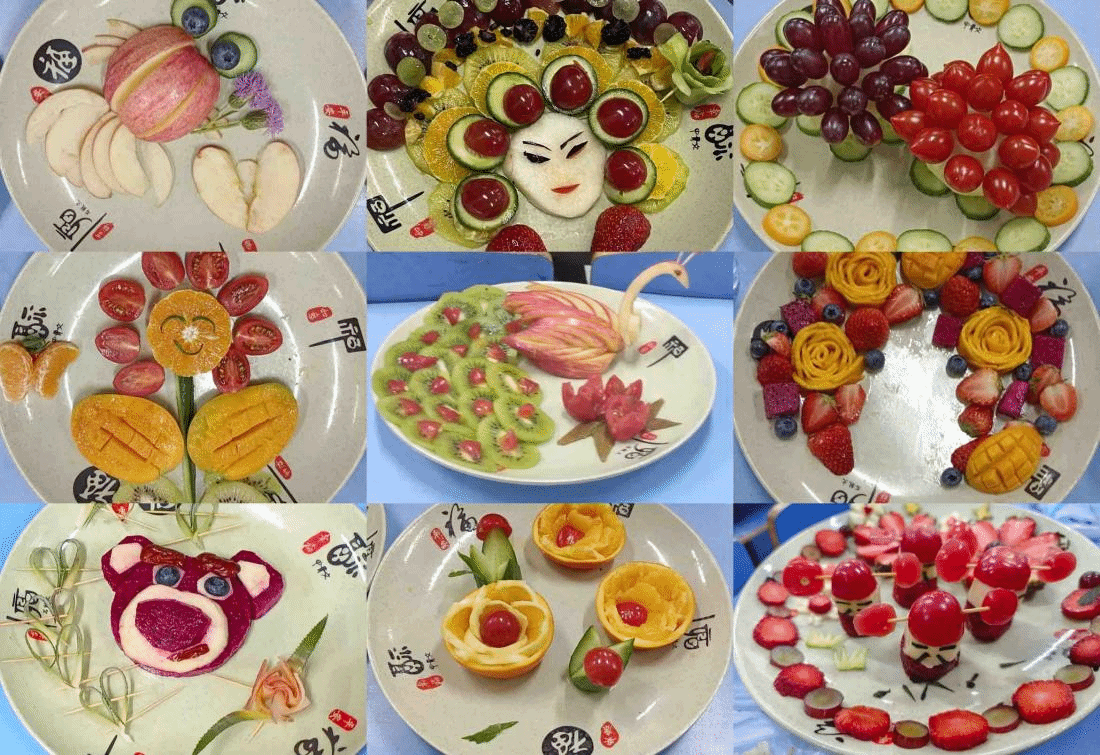 水果拼盘环节,各队“厨师”们默契配合,各显神通。在他们的巧手下,栩栩如生的造型一一呈现,有用火龙果堆砌的“草莓熊”,用橙子、草莓等摆放的“京剧脸谱”,用苹果片装饰的“金鱼”……其中,“孔雀开屏”作品吸引了大家的目光,猕猴桃切成的片当作羽毛,中间用小番茄作点缀,苹果片雕刻而成的“孔雀”呈开屏状。