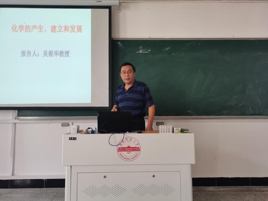 报告中,吴根华简要回顾了古代化学的产生和近代化学的建立,着重阐述了现代化学的研究对象、研究内容、研究方法、研究目的和发展趋势。此次报告思路清晰、内容丰富、层次分明,使同学们对化学的过去、现在和未来有了比较全面的了解,提高了大家学习化学、研究化学的兴趣。(撰稿/摄影:吴琼 审核:刘志强 鲍青燕)