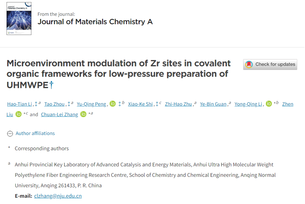 近日,伟德国际VICTOR1946在国际权威期刊《Journal of Materials Chemistry A》(影响因子10.7)发表题为“Microenvironment modulation of Zr sites in covalent organic frameworks for low-pressure preparation of UHMWPE”的论文 ,并入选该期刊热点文章。该论文第一作者为公司化学专业2022级硕士生李浩天,第一通讯作者为公司伟德国际VICTOR1946张传磊副教授。