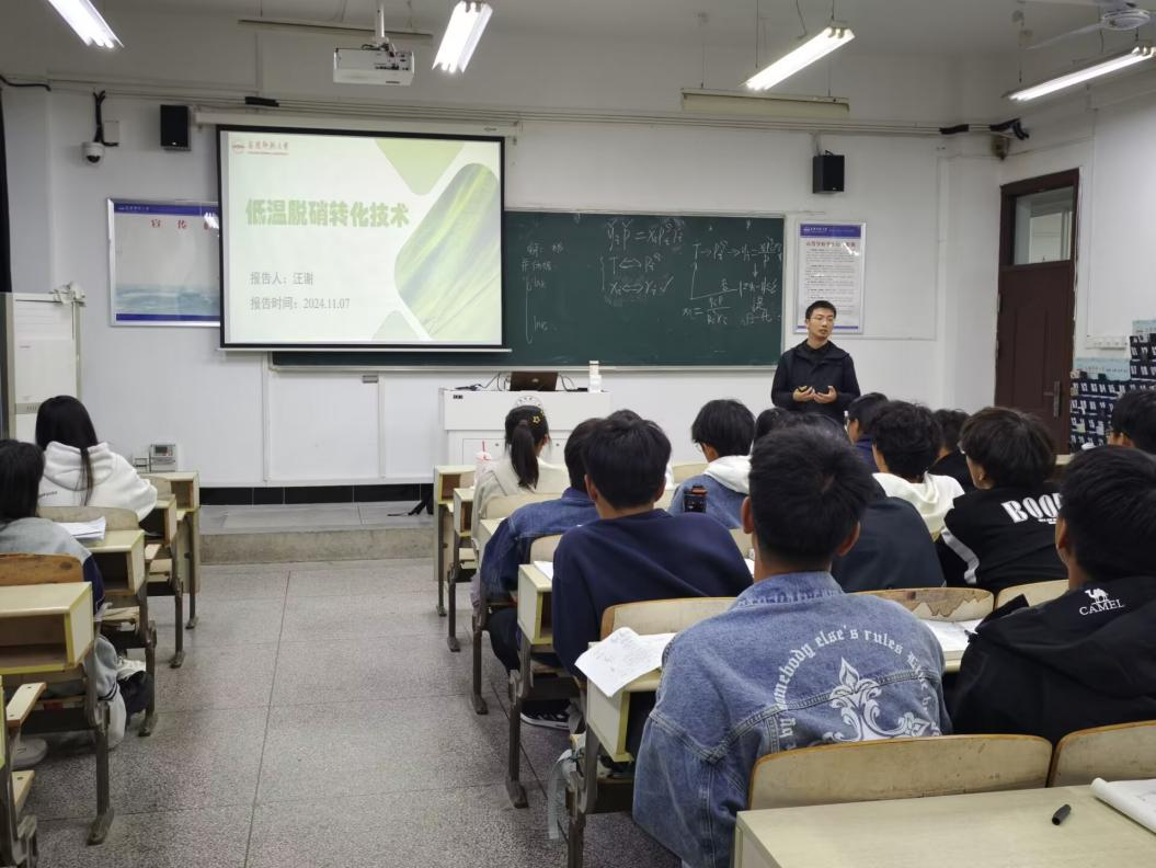 11月7日晚,伟德国际VICTOR1946汪谢博士在教学楼B410教室为材料化学专业2024级员工做了一场关于低温脱硝转化技术的学术报告。