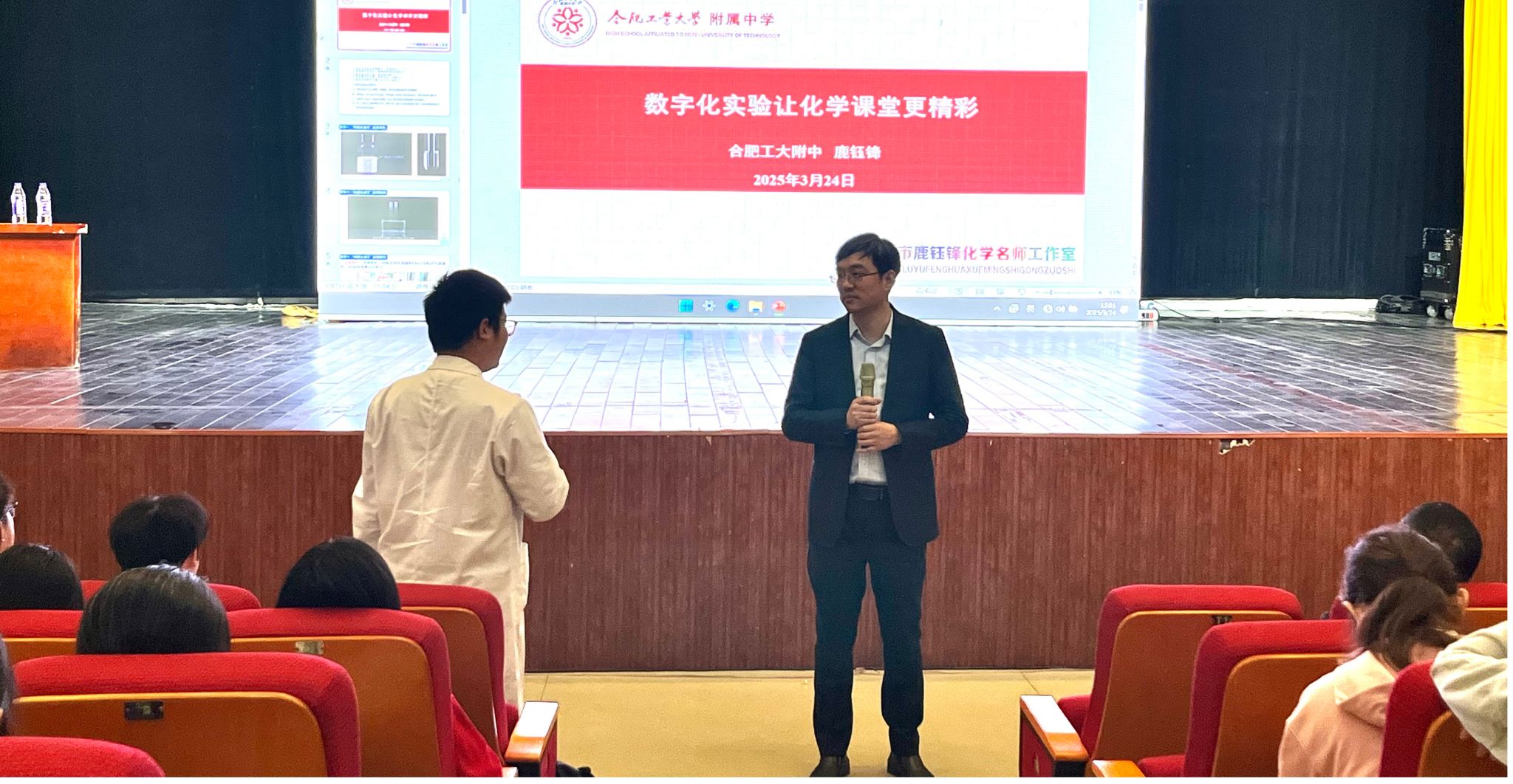 安庆七中化学教研组长訾艳结合自身经历,为师生带来“成长,在输出与输入之间”的报告,分享了不同学习阶段面临的挑战与机遇,以及突破困境的独特学习方法。安庆市化学教研员饶玉流以“大概念统领下的大单元教学设计”为题,深入解读教育领域前沿理念——大概念,介绍了单元设计的全新思路。 合肥工业大学附属中学高级教师鹿钰锋在“数字化实验让化学课堂更精彩”的报告中,围绕数字化实验设计,展示了数字化技术在推动教学水平进阶、师范生教学技能提升等方面的重要性。安徽省化学教研员朱成东报告了“新课程背景下化学教师专业发展”,为即将走上工作岗位的师范生提供了切实可行的发展路径。