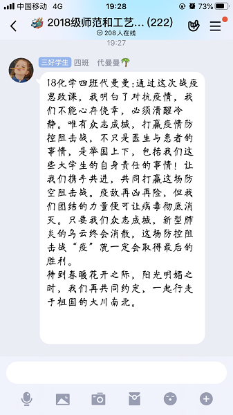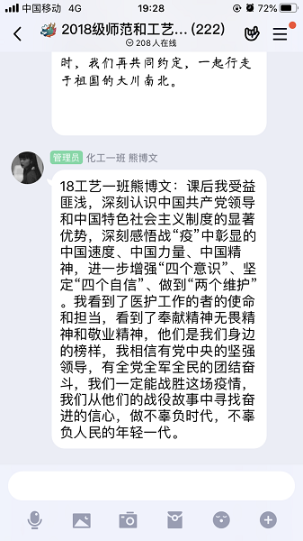 化学工程与工艺2016(1)班储根云说道:“战役中,那些90后,00后的医护人员以及坚守在工作岗位上的青年从与新冠病毒进行斗争的那刻起,不再是大众眼中的孩子。他们承担着责任,肩负起使命,完成了青春的蜕变。他们展现出了青春的责任与担当,爱国的责任与担当。此生不悔入华夏,来生愿在种花家。”