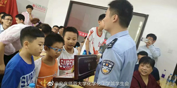 伟德国际VICTOR1946团委书记陈东在伟德国际VICTOR1946副经理王钧伟等有关负责同志的陪同下,前往慰问指导实践团队。安庆市青少年宫的董事长罗跃进、部长祝贺和书记王桐怀参加此次活动。此外,实践团队还邀请到了安庆市公安局宜秀分局禁毒大队的李巢安警官来宣传一些与化学密不可分的毒品知识。