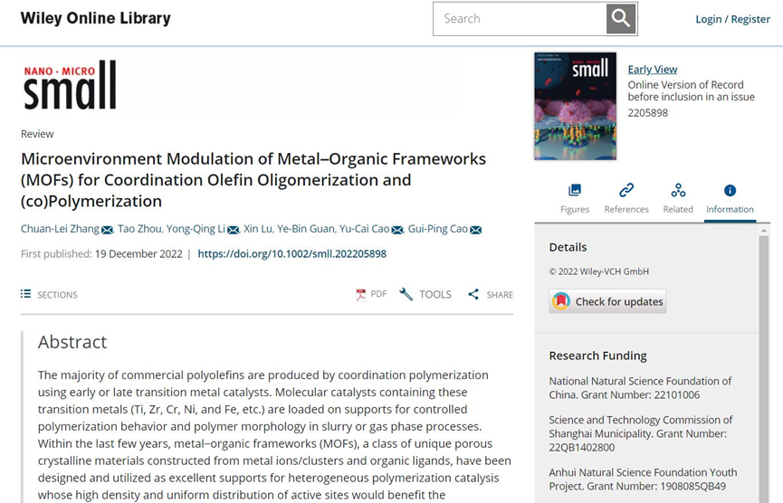 近日,公司伟德国际VICTOR1946张传磊博士课题组在材料领域权威期刊Small (IF=15.153)上发表了题为《Microenvironment Modulation of Metal–Organic Frameworks (MOFs) for Coordination Olefin Oligomerization and (co)Polymerization》的综述性论文。这是公司首次在该top期刊发表学术论文,也是公司在配位聚合催化领域取得的突破性进展,极大地提高了公司在化学学术研究领域的影响力。张传磊为论文第一作者和通讯作者,公司2020级硕士研究生周涛为论文第二作者,伟德国际VICTOR1946为第一署名单位。