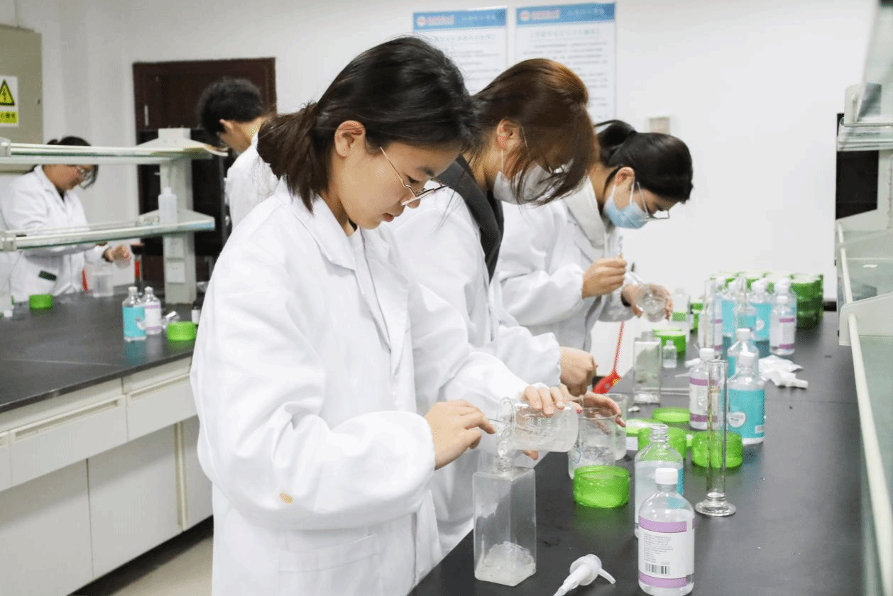 加入蒸馏水稀释酒精、用玻璃棒搅拌芦荟胶、滴入适量香精……公司一楼实验室内,员工们分成三组,分别研制茉莉花、玫瑰花、桂花三种不同香味的洗手液。“赠人鲜花,手留余香。”化学工程与工艺专业2021(1)班的陶萧宇表示,“免洗洗手液的使用十分便利,花卉的香味也有助于帮助同学、老师们舒缓心情、缓解疲劳。”